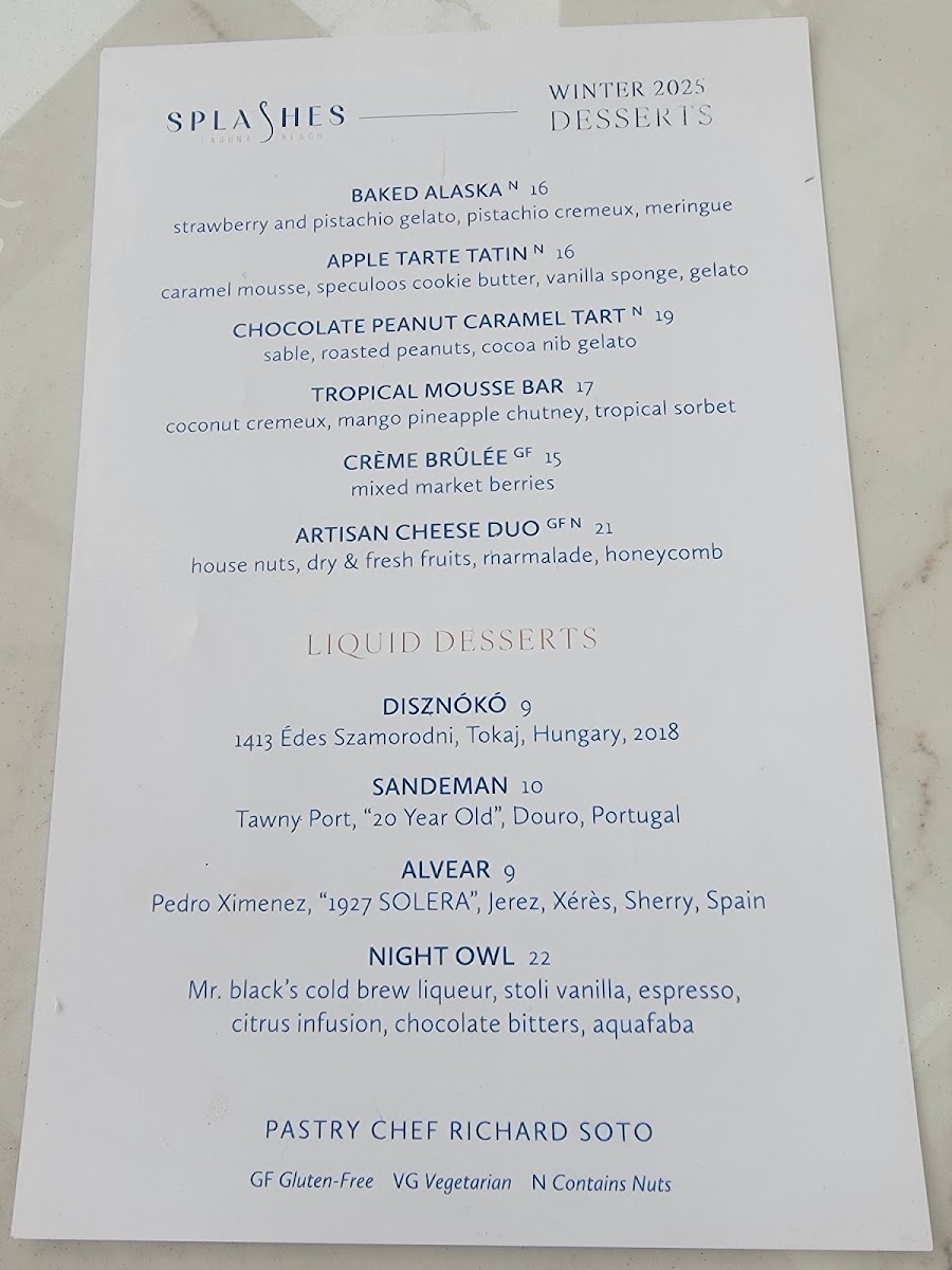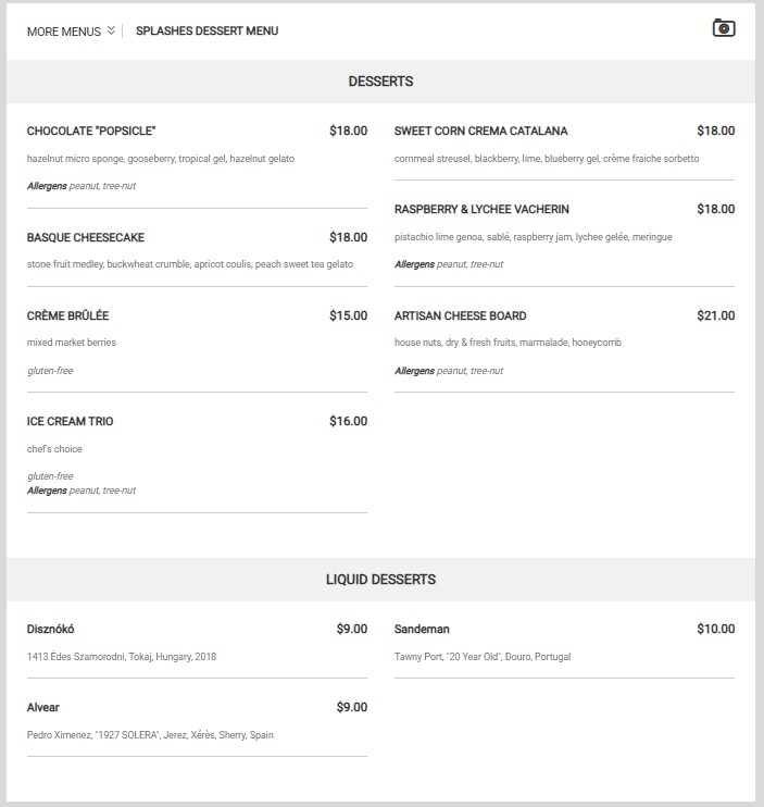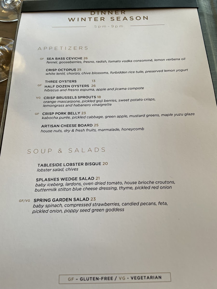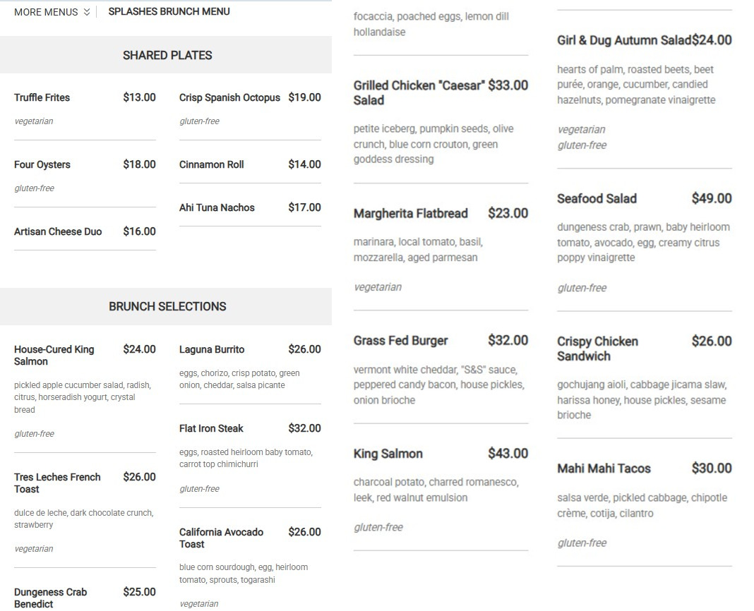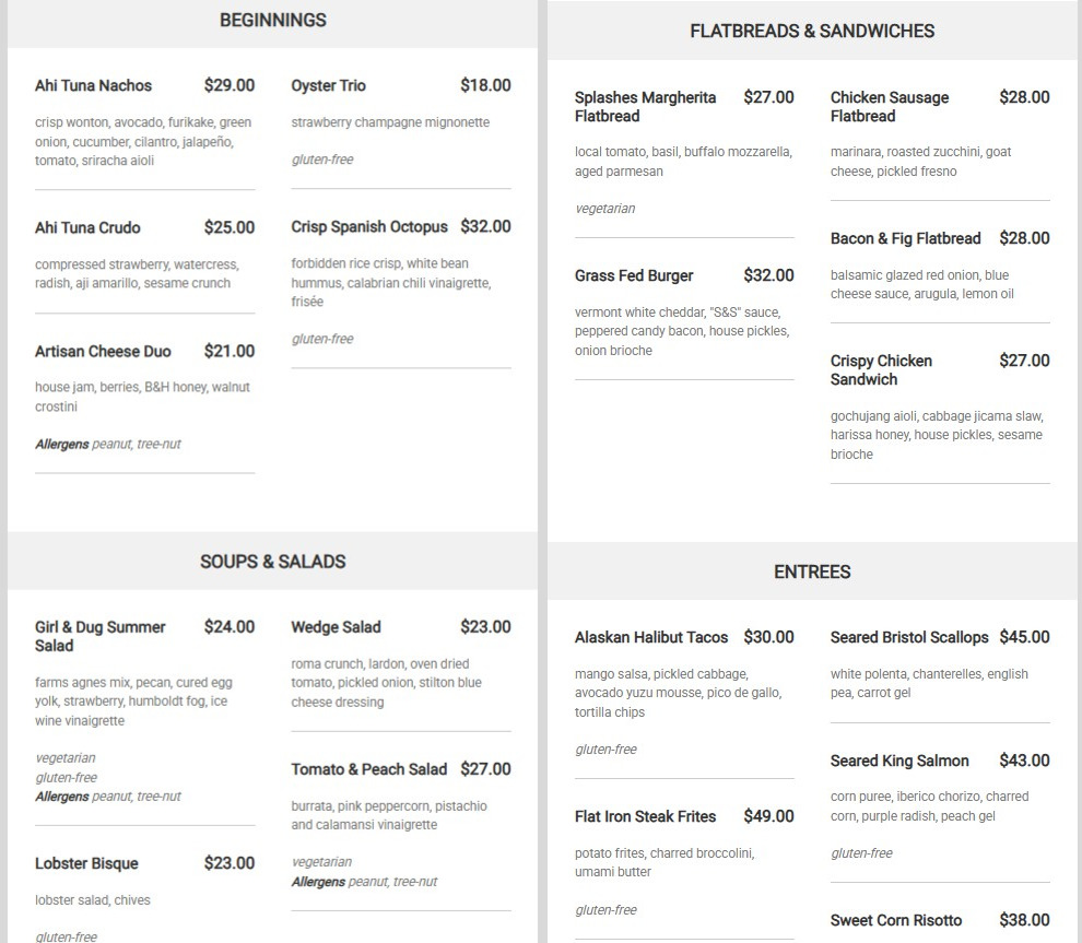 Splashes Restaurant Menu