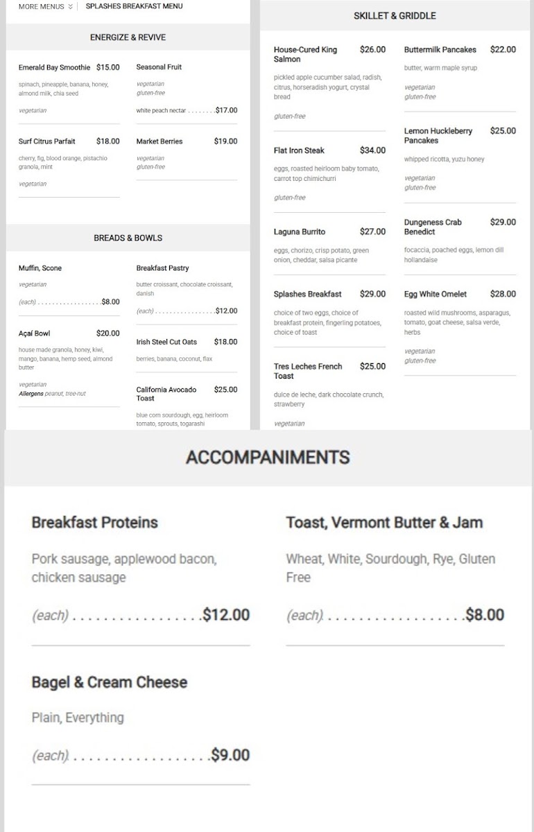 Mornings might find you enjoying light, energizing options like the Emerald Bay Smoothie or the California Avocado Toast topped with a perfectly poached egg. Brunch favorites such as Tres Leches French Toast and Meyer Lemon Huckleberry Pancakes add a sweet, satisfying touch to the start of the day.